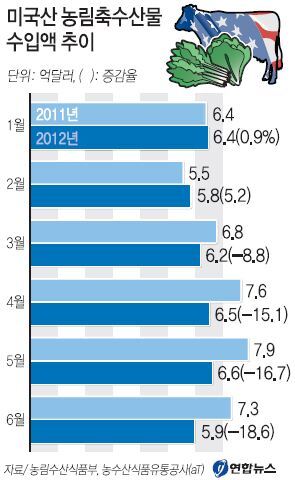 지난 1월 미국산 농림축수산물 수입액은 작년 동기보다 0.9% 증가한 뒤 2월 5.2% 늘었지만 한·미 FTA가 발효된 3월 8.8% 줄면서 감소세로 전환됐다. 이후 4월 15.1%, 5월 16.7%, 6월 18.6% 등으로 감소폭이 확대됐다.