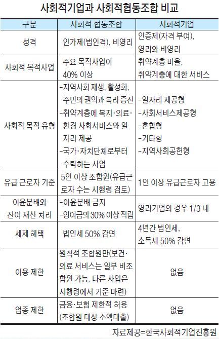 소액·소규모로 다양한 형태 '법인' 가능 / 3개 이상 모여 '연합회'도 만들 수 있어 / 수행할 제3의 경제 영역 개념 정립 안 돼 / 사회적 협동조합 조건 까탈 실효성 의문