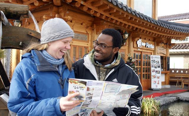 | ▲ 전북 순환관광 버스로 전주한옥마을을 찾은 외국인들이 환하게 웃고 있다. | ||
