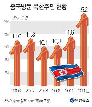 연합뉴스가 29일 중국 정부의 `외국인입국현황(2006~2012년)' 자료를 분석한 결과, 중국방문 북한주민은 2006년 11만명, 2007년 11만3천명, 2008년 10만1천명, 2009년 10만3천명, 2010년 11만6천명, 2011년 15만2천명으로 파악됐다.