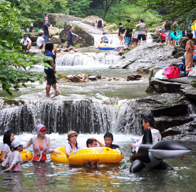 ▲ 강천산 군립공원의 맑은 계곡물에서 더위를 식히고 있는 피서객