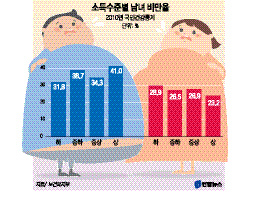 30일 보건복지부의 '2010 국민건강통계'에 따르면 8000여명의 조사 대상을 월가구소득(가구원수 고려)에 따라 4가지 계층(상·중상·중하·하)으로 나눠 분석한 결과 여성의 경우 소득 하위층의 비만율(체질량지수 25이상)이 28.9%인 데 비해 상위층은 23.2%에 그쳤다. /연합뉴스