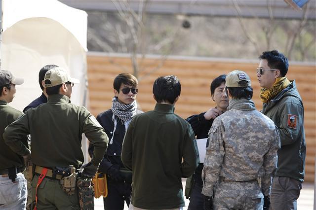 ▲ (주)건파워 홍용표(맨 오른쪽) 대표와 직원들이 서바이벌 관련 첨단 제품을 시범 가동하기 위한 모의전투에 앞서 작전구상을 벌이고 있다.