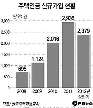 주택연금은 2007년 7월 출시 이후 빠르게 성장하고 있다. 2008년 695건인 가입건수는 2009년 1천124건으로 61.7% 증가했다. 2010년(2천16건)에는 전년 대비 79.4%, 2011년(2천936건)에는 45.6% 늘었다.