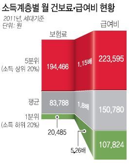 소득 상위 20% 계층은 한 달에 평균 19만4천466원의 보험료를 납부하고 급여로 1.2배인 22만3천595원을 받았다.