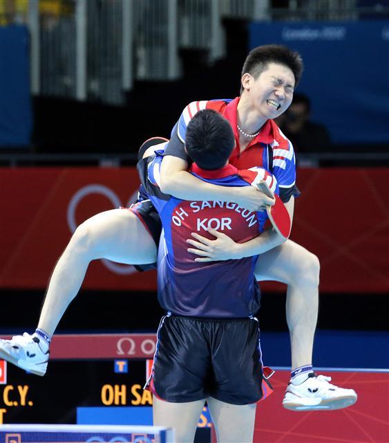 ▲ 6일 오후(현지시간) 영국 런던 엑셀 아레나에서 열린 남자 탁구 단체전 준결승 홍콩과의 경기에서 유승민이 세번째 경기인 복식에서 승리한 뒤 오상은의 품에 안기며 기뻐하고 있다. 연합뉴스