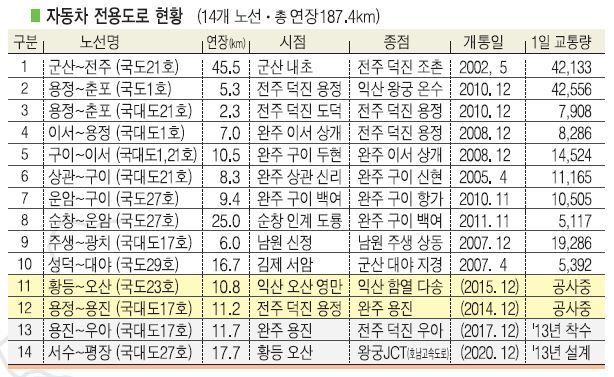 도내에서는 △군산∼전주(45.5km)와 △전주 용정∼익산 춘포(5.3km) 구간의 교통량이 다른 도로에 비해 압도적으로 많다.