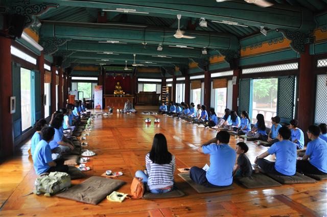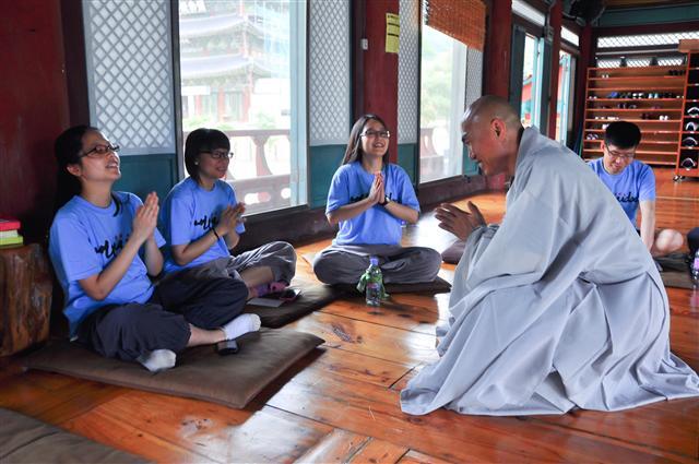 ▲ 템플스테이 참가가들이 자유시간 중 스님과 함께 대화를 나누고 있다.