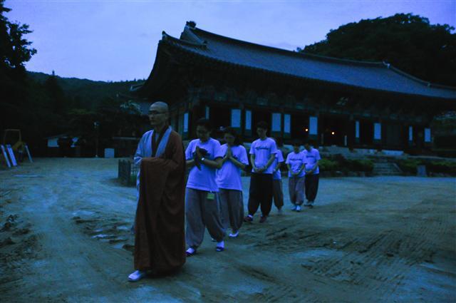 ▲ 템플스테이 참가자들이 저녁예불 후 안행을 하고있다.