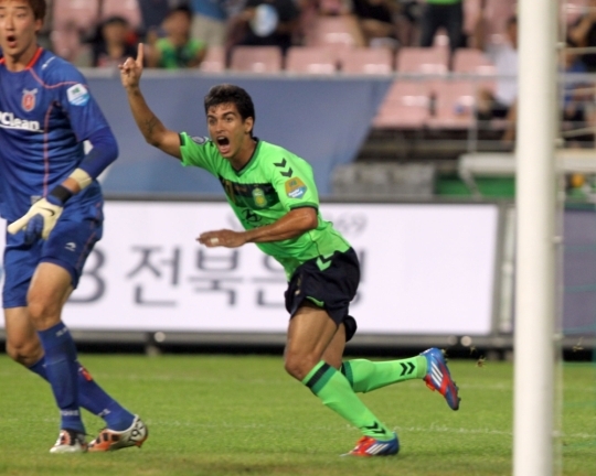 전북 현대가 2012 프로축구 현대오일뱅크 K리그 선두 자리를 되찾았다. 전북은 19일 전북 전주월드컵경기장에서 열린 28라운드 제주 유나이티드와의 홈경기에서 3-3으로 비겼다. 17승7무4패가 된 전북은 FC서울과 동률을 이뤘으나 골 득실에서 10점을 앞서 서울을 제치고 1위로 올라섰다. 사진은 종료 직전 레오나르도가 동점골을 넣은 뒤 환호하고 있는 모습. 연합뉴스