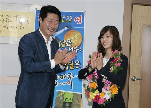 ▲ 익산시청 펜싱팀 소속으로 런던올림픽에서 금메달을 딴 김지연이 17일 익산시청에서 이한수 시장과 악수를 한뒤 함께 박수를 치고 있다. 연합뉴스