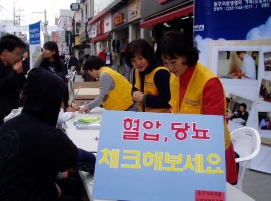 | ▲ 원주의료생협 조합원들이 시민을 대상으로 보건활동을 펼치고 있는 모습. 사진제공=원주협동사회네트워크 | ||