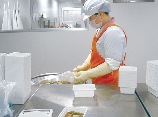 | ▲ 원주협동사회네트워크에 속한 친환경급식센터 맞두레(주)에서 결식아동에게 공급할 도시락을 담고 있는 모습. 사진제공=원주협동사회네트워크 | ||