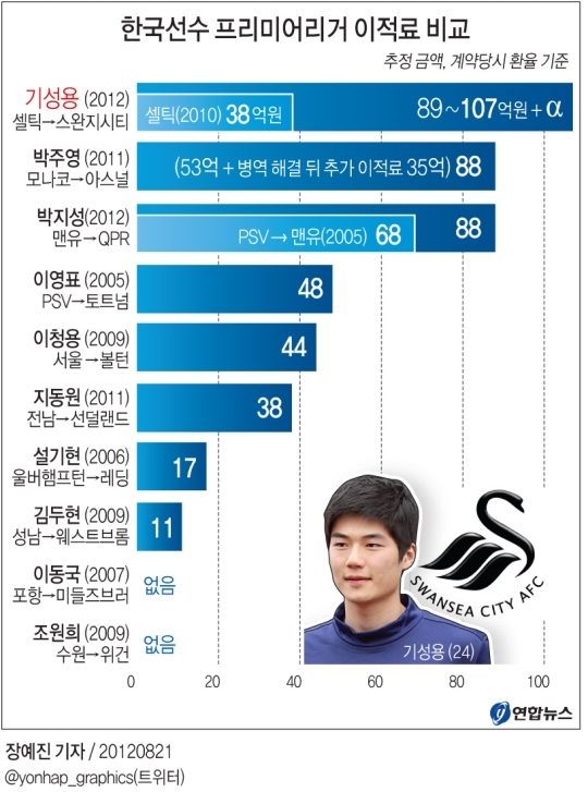 21일(한국시간) 스완지시티의 휴 젠킨스 회장이 스코틀랜드 STV와의 인터뷰를 통해 기성용의 영입을 공식화한 가운데 BBC 등 현지 주요 언론을 통해 언급된 기성용의 이적료는 600만 파운드(107억원) 수준이다.
