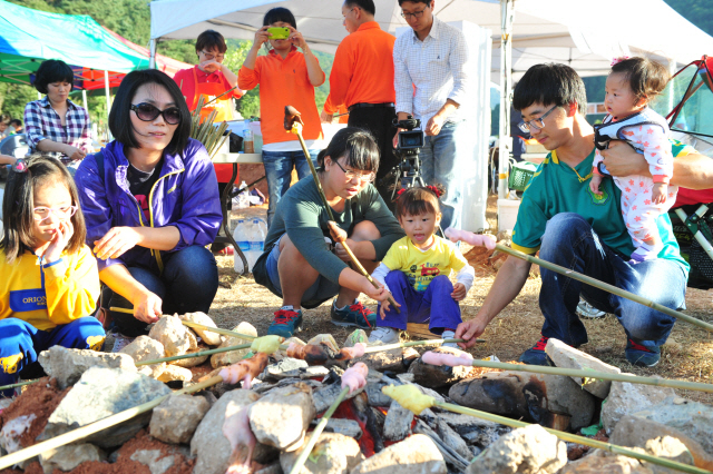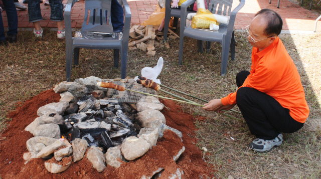 ▲ 완주 와일드푸드 축제에서 관람객들이 화덕구이 체험을 하고 있다.