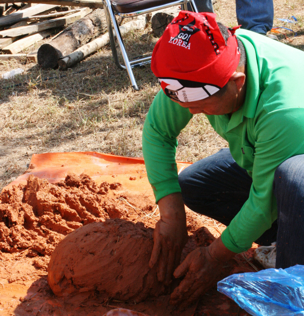 ▲ 갓 잡은 닭을 털도 뽑지 않고 황토를 덮고 있는 모습.