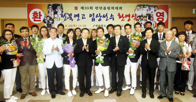 23일 전북도청 의전실에서 열린 런던올림픽 전북연고 입상선수 환영식에 참석한 선수들이 꽃다발을 받고 환한 웃음을 보이고 있다. 이날 환영식에는 금메달을 딴 이성진·최현주(이상 양궁), 김지연·구본길·김정환·오은석(이상 펜싱) 선수를 비롯, 동메달을 목에 건 정재성(배드민턴) 선수와 지도자 등 20여명이 참석했다.
