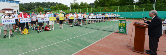 | ▲ 25일 열린 '제23회 전북직장대항테니스대회' 경기에 앞서 전북일보 김남곤 사장이 인사말을 하고 있다.