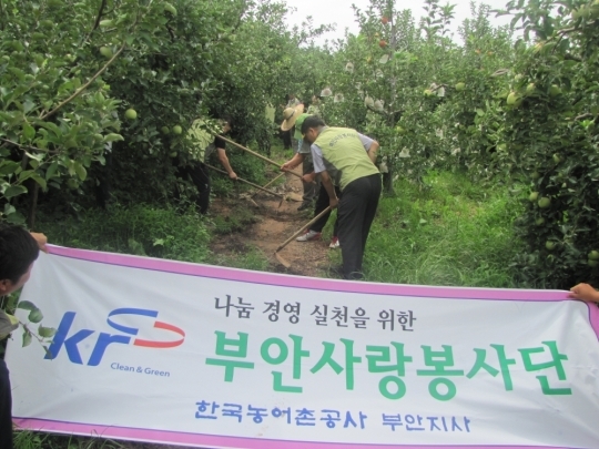 한국농어촌공사 부안지사(지사장 김광호)는 27일 직원30여명이 초대형 태풍 '볼라벤'의 직접적인 영향으로 과수농가의 피해 예방을 위해 농가를 방문하여 대민 지원을 실시하였다.