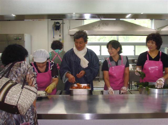 ▲ 28일 이석 황실문화재단 총재가 진안군 노인전문요양원에서 배식봉사를 하고 있다.