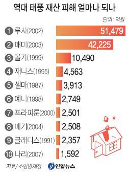 역대 태풍 중 가장 큰 재산피해를 낸 것은 지난 2002년 8월 발생한 태풍 루사다. 이 태풍은 무려 5조1천479억원의 재산피해를 냈다. 인명피해는 246명, 이재민은 6만3천85명에 달했다. 이어 2003년 9월 태풍 매미가 4조2천225억원, 1999년 7월 태풍 올가가 1조490억원으로 모두 1조원대를 넘어서는 재산피해를 냈다.