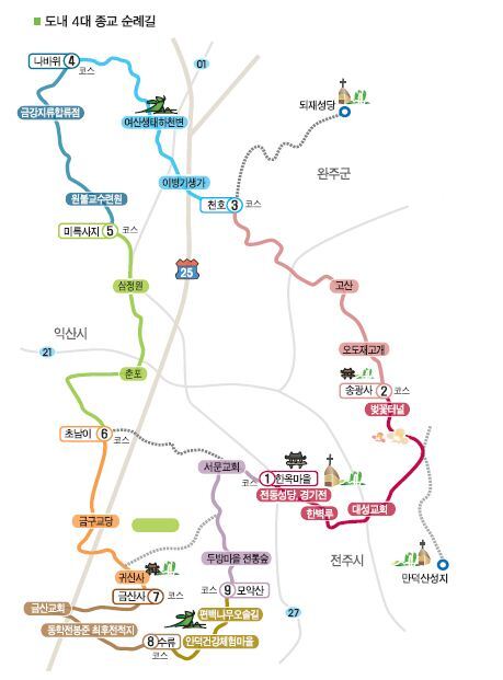 앞서 전북도는 순례길 정비에도 힘을 쏟았다. 방향 표지판 900여개, 안내판 70여개를 세우고 길 중간에 화장실·벤치 등 쉼터도 마련했다. 주변의 절·성당·교회는 물론 동네의 마을회관을 숙박장소로 제공하는 데에도 신경을 썼다.