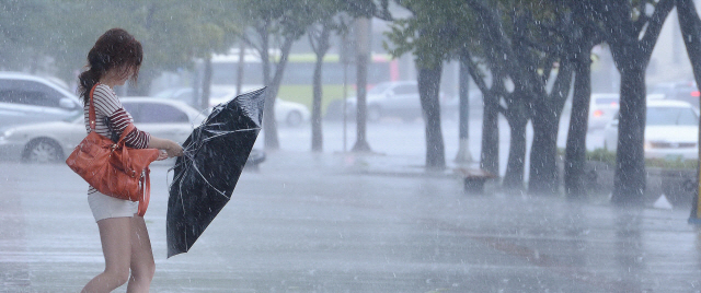 30일 태풍 '덴빈'이 강한 바람과 함께 새만금에 222mm의 비를 뿌리는 등 전북지역에 많은 비가 내린 가운데, 전주 금암동 버스정류장에서 한 시민이 강한 비바람에 우산이 뒤집어져 당황해 하고 있다.
