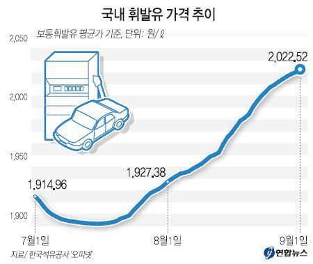 국내 모든 지역의 휘발유값이 2천원대를 기록한 것은 지난 5월20일 이후 약 석달 보름만이다. 이날 12시 현재 전국 휘발유값은 평균 2천23원으로 최근 한달 사이 최고치를 기록했다.