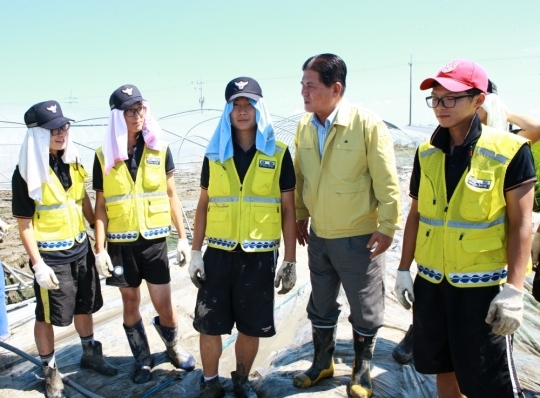 이들은 이날 동진면 동전리 농원마을 농가의 감자 비닐하우스를 비롯한 159동의 비닐 제거작업과 7개 과수농가를 찾아 낙과 수거 및 피해 과수목 세우기 등을 실시했다.