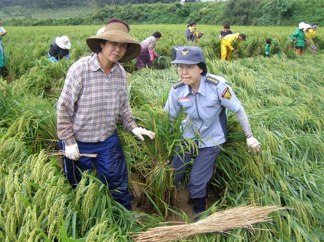 순창군 의용소방대 연합회(회장 최기순) 회원 30여명은 지난 5일 유등면 오교리에서 벼 묶어세우기 작업을 하며 구슬땀을 흘렸다.