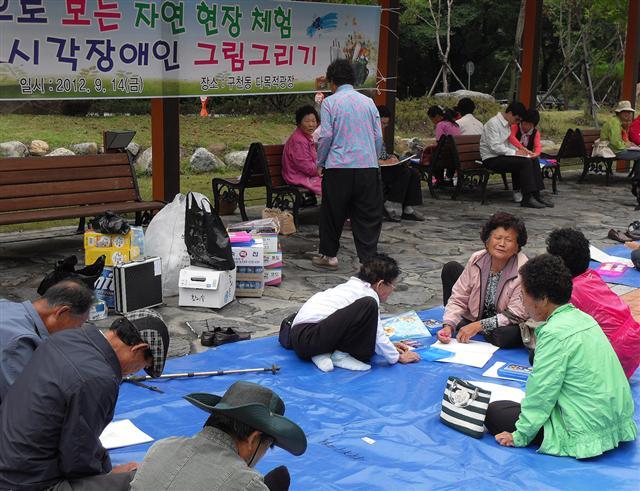▲ 무주구천동에서 지난 14일 시각장애인과 자원봉사자 43명이 참여한 가운데 시각장애인 그림그리기 체험 프로그램이 진행됐다.
