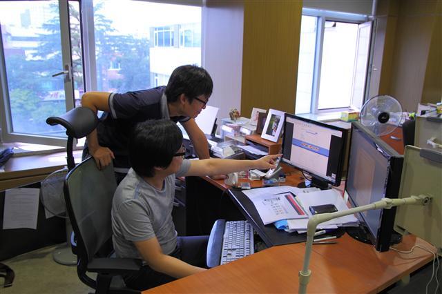 ▲ 이너인터랙티브 양인수 대표(왼쪽)와 장인수 대표가 새로 개발한 지식허브 솔루션의 단점을 보완하기 위한 연구작업을 벌이고 있다.