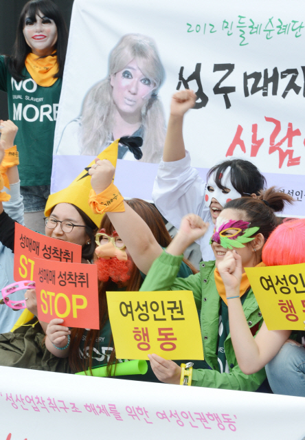 18일 전주 걷고싶은거리에서 열린 성매매방지법 시행 8주년 기념 및 성산업 착취구조 해체를 위한 시민 한마당행사에 참석자들이 가면을쓰고 퍼포먼스를 벌이고 있다.······ ·