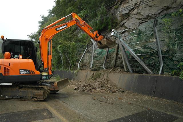 ▲ 임실군중기연합회 회원들이 산사태가 난 도로 현장에서 중장비를 동원해 응급복구 자원 봉사활동을 펼치고 있다.