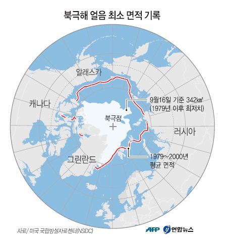 이는 NSIDC가 북극해 면적을 기록하기 시작한 1979년 이후 최저치다. 연합뉴스
