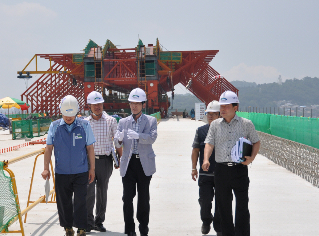 ▲ 충남에서 새만금으로의 접근을 위해 건설되는 군장대교 건설 현장을 구자명 청장(가운데)이 관계자들과 둘러보고 있다.