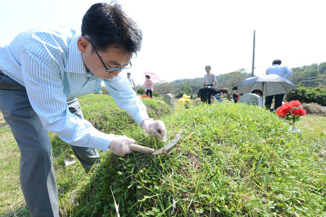 추석을 일주일 앞둔 22일 전주 효자공원묘지. 서울에서 내려온 한 남성이 벌초를 하고 있다.·