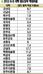 특히 군장대(6.8→15.7→17.7%)와 원광보건대(3.2→3.4→5.3%), 전주비전대(3.6→4.2→9.7%)는 3년 연속(2010~2012) 중도탈락 학생비율이 증가한 실정.