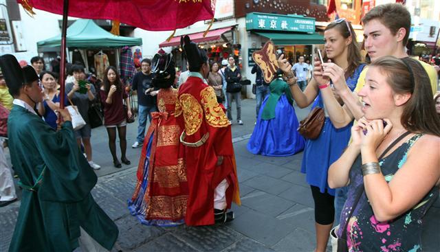 23일 오후 전통문화축제가 열리고 있는 서울 인사동에서 외국인들이 궁중의상 퍼레이드를 보고 있다. 이번 축제는 25일까지 열린다. 연합뉴스