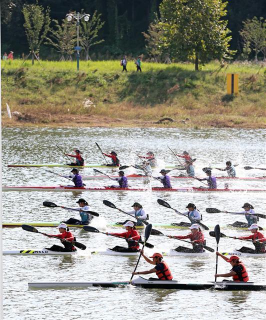 24일 대구 동촌카누경기장에서 열린 제30회 전국카누선수권대회 여자고등부 K-4 경기에 참가한 선수들이 물보라를 일으키며 질주하고 있다. 연합뉴스
