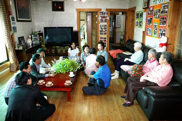 ▲ 26일 추석을 앞두고 사회복지시설을 방문한 진안군의회 의원들이 어르신들과 함께 대화를 나누고 있다.