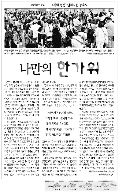 경기도 분당에 사는 직장인 이모(31)씨는 추석 연휴에 아내와 단 둘이서 일본 온천 여행을 떠나기로 했다. 추석 차례를 지내고 나서다. 가족들은 평소에 자주 보기 때문에 아내를 위해 특별히 시간을 할애했다. 2박 3일의 여행이다. 이씨는 "여행하면서 카카오톡으로 다른 가족들에게 중계할 것"이라며 얼굴이 상기됐다. 스마트폰으로 형제들과 언제든 소통이 가능한데 굳이 황금 연휴에 한곳에 모여 불편까지 감수해야 하는지 모르겠다는 게 이씨의 평소 생각이다.