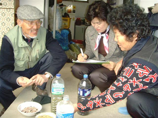 ▲ 한국토종연구회 안완식 박사(왼쪽)가 정읍 태인면의 한 농가에서 토종 종자를 살펴보고 있다.