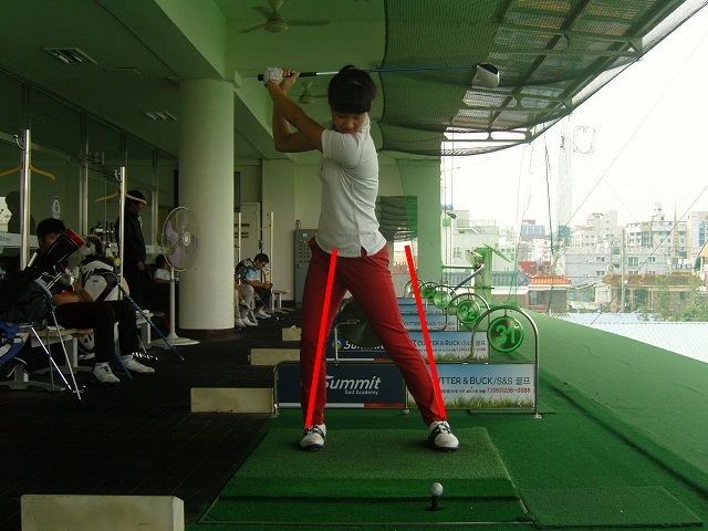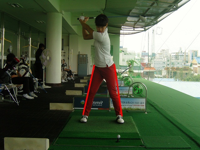 사진에서 보듯이 사진1에서 만들어진 두 개의 선이 백스윙 동작의 사진2와 같이 두 개의 선 안에 있어야 좋은 체중이동과 회전이라 할 수 있다. 따라서 많이 움직이는 고관절을 스웨이동작에서 회전동작으로 전환시키는 것은 오른쪽 고관절을 뒤로 바로 돌리는 기분이 들여야 한다. 백스윙이 오른쪽으로 회전한다는 것을 착각하고 고관절을 사진3과 같이 오른쪽으로 민다면 고관절은 스웨이 되고, 체중이동이 원활하게 이루어 질수 없다.