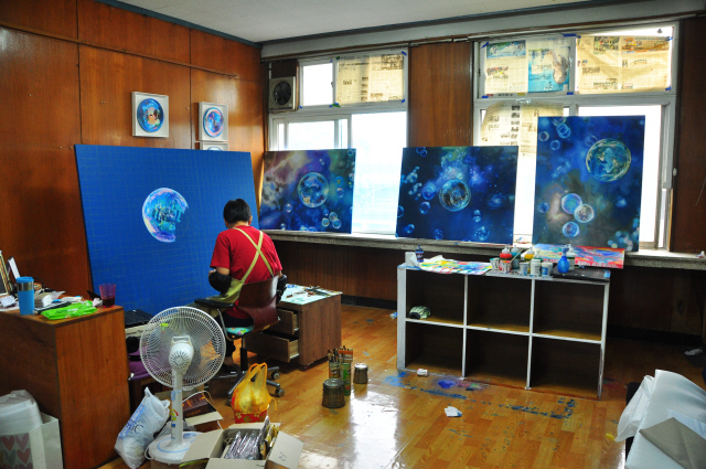 ▲ 익옥수리조합 창작레지던시 프로그램에 참여한 작가가 창작 작업에 몰두하고 있다.
