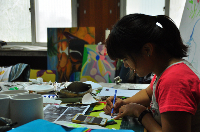 ▲ 익옥수리조합 레지던시 입주작가 최진희씨의 작업실. 다음작품에 대한 에스키스중이다.
