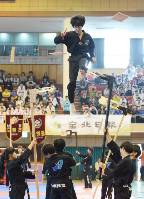 6일 우석대학교에서 열린 전북일보배 태권도대회 개막식에 우석대학교 태권도학과 학생들이 축하공연을 펼치고 있다.