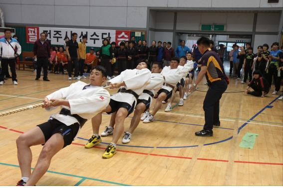 줄다리기 경기는 한 팀당 8명의 선수가 참가하는데, 선수들의 체중 합계가 남자는 600kg, 여자는 500kg 이내로 제한된다.