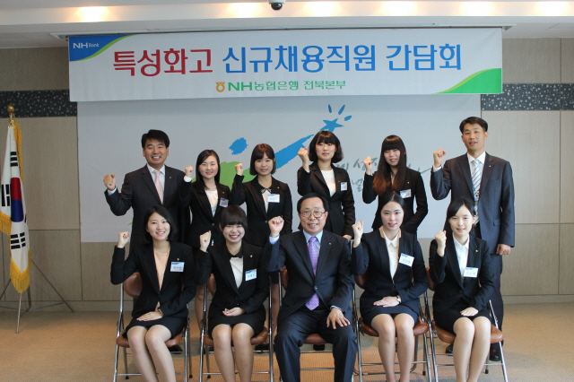 ▲ NH농협은행 전북본부에 채용된 도내 특성화 및 종합고 졸업예정자 8명이 김문규 본부장(앞줄 가운데) 등 관계자들과 기념촬영을 하고 있다.