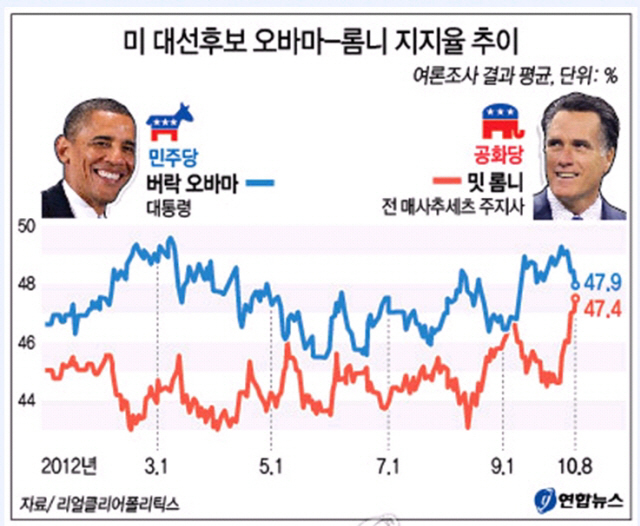 8일(현지시간) 중립적인 퓨리서치센터 조사(10·4~7일)에 따르면 투표 가능성이 있는 유권자(투표예정자)에게 `오늘 선거가 있다면 누구를 지지하겠는가'라고 물은 결과 49%가 롬니를, 45%가 오바마를 꼽았다.